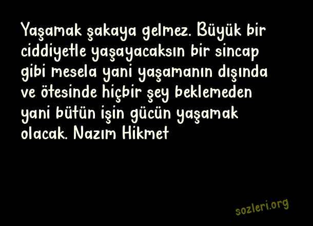 Yaşamak şakaya gelmez. Büyük bir ciddiyetle yaşayacaksın bir sincap gibi mesela yani yaşamanın dışında ve ötesinde hiçbir şey beklemeden yani bütün işin gücün yaşamak olacak. Nazım Hikmet ( Büyük Sözler )