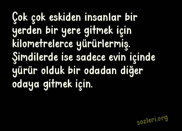 Çok çok eskiden insanlar bir yerden bir yere gitmek için kilometrelerce yürürlermiş. Şimdilerde ise sadece evin içinde yürür olduk bir odadan diğer odaya gitmek için. ( Yürümek )
