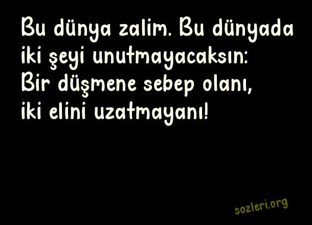 Bu dünya zalim. Bu dünyada iki şeyi unutmayacaksın: Bir düşmene sebep olanı, iki elini uzatmayanı! ( Zalim Dünya )