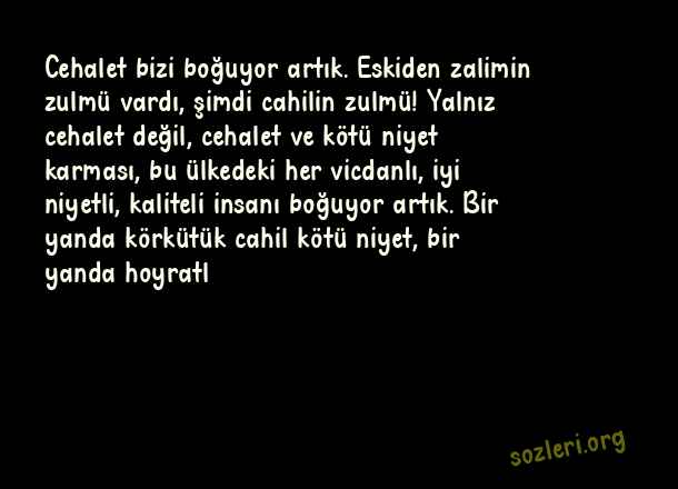 Cehalet bizi boğuyor artık. Eskiden zalimin zulmü vardı, şimdi cahilin zulmü! Yalnız cehalet değil, cehalet ve kötü niyet karması, bu ülkedeki her vicdanlı, iyi niyetli, kaliteli insanı boğuyor artık. Bir yanda körkütük cahil kötü niyet, bir yanda hoyratl ( Zalim Dünya )