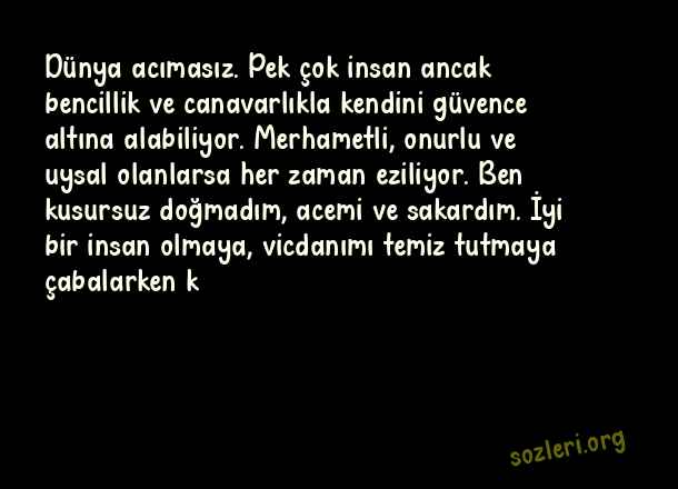 Dünya acımasız. Pek çok insan ancak bencillik ve canavarlıkla kendini güvence altına alabiliyor. Merhametli, onurlu ve uysal olanlarsa her zaman eziliyor. Ben kusursuz doğmadım, acemi ve sakardım. İyi bir insan olmaya, vicdanımı temiz tutmaya çabalarken k ( Zalim Dünya )