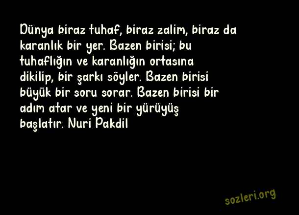 Dünya biraz tuhaf, biraz zalim, biraz da karanlık bir yer. Bazen birisi; bu tuhaflığın ve karanlığın ortasına dikilip, bir şarkı söyler. Bazen birisi büyük bir soru sorar. Bazen birisi bir adım atar ve yeni bir yürüyüş başlatır. Nuri Pakdil ( Zalim Dünya )