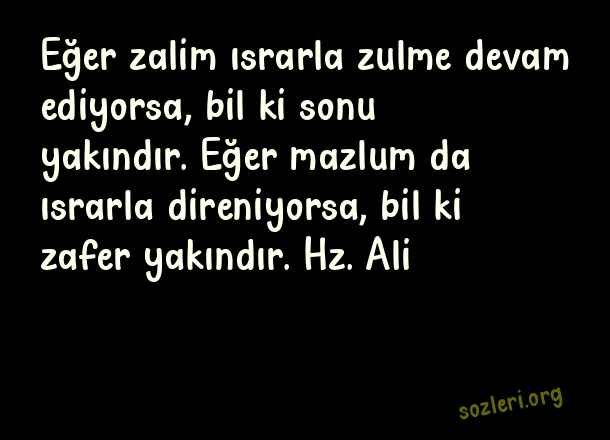 Eğer zalim ısrarla zulme devam ediyorsa, bil ki sonu yakındır. Eğer mazlum da ısrarla direniyorsa, bil ki zafer yakındır. Hz. Ali ( Zalim Dünya )