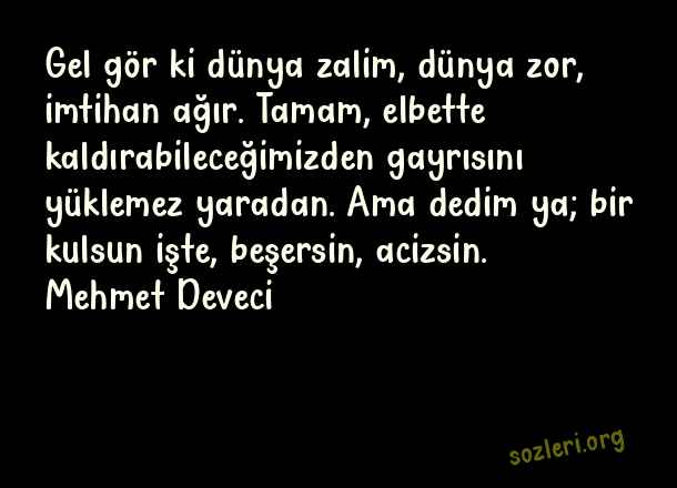 Gel gör ki dünya zalim, dünya zor, imtihan ağır. Tamam, elbette kaldırabileceğimizden gayrısını yüklemez yaradan. Ama dedim ya; bir kulsun işte, beşersin, acizsin. Mehmet Deveci ( Zalim Dünya )