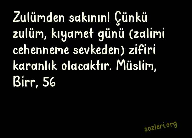 Zulümden sakının! Çünkü zulüm, kıyamet günü (zalimi cehenneme sevkeden) zifiri karanlık olacaktır. Müslim, Birr, 56 ( Zalim Dünya )