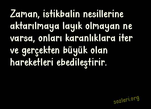 Zaman, istikbalin nesillerine aktarılmaya layık olmayan ne varsa, onları karanlıklara iter ve gerçekten büyük olan hareketleri ebedileştirir. ( Zaman İle İlgili Güzel Sözler )