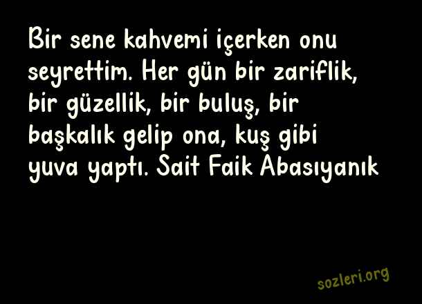 Bir sene kahvemi içerken onu seyrettim. Her gün bir zariflik, bir güzellik, bir buluş, bir başkalık gelip ona, kuş gibi yuva yaptı. Sait Faik Abasıyanık ( Zarafet )