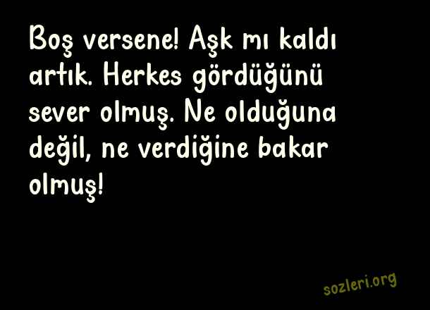 Boş versene! Aşk mı kaldı artık. Herkes gördüğünü sever olmuş. Ne olduğuna değil, ne verdiğine bakar olmuş! ( Adam Gibi Sözler )