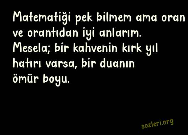 Matematiği pek bilmem ama oran ve orantıdan iyi anlarım. Mesela; bir kahvenin kırk yıl hatırı varsa, bir duanın ömür boyu. ( Adam Gibi Sözler )