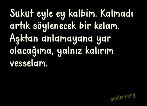 Sukut eyle ey kalbim. Kalmadı artık söylenecek bir kelam. Aşktan anlamayana yar olacağıma, yalnız kalırım vesselam. ( Adam Gibi Sözler )