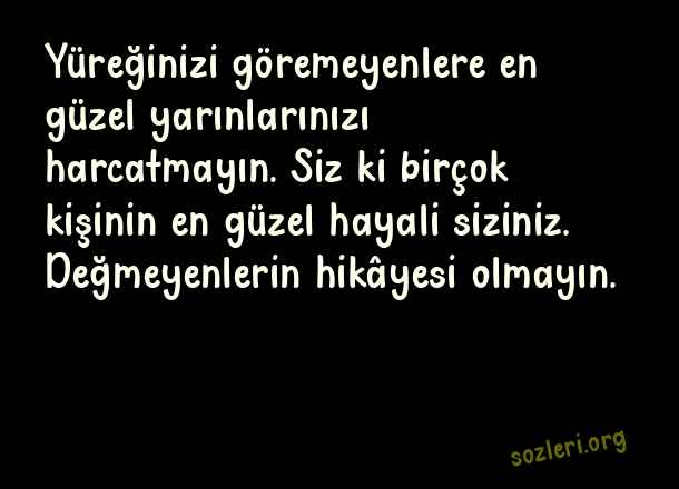 Yüreğinizi göremeyenlere en güzel yarınlarınızı harcatmayın. Siz ki birçok kişinin en güzel hayali siziniz. Değmeyenlerin hikâyesi olmayın. ( Adam Gibi Sözler )
