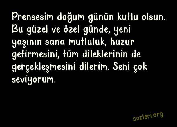 Prensesim doğum günün kutlu olsun. Bu güzel ve özel günde, yeni yaşının sana mutluluk, huzur getirmesini, tüm dileklerinin de gerçekleşmesini dilerim. Seni çok seviyorum. ( Anneden Kızına Doğum Günü )