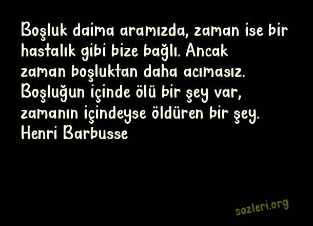 Boşluk daima aramızda, zaman ise bir hastalık gibi bize bağlı. Ancak zaman boşluktan daha acımasız. Boşluğun içinde ölü bir şey var, zamanın içindeyse öldüren bir şey. Henri Barbusse ( Boşluk )