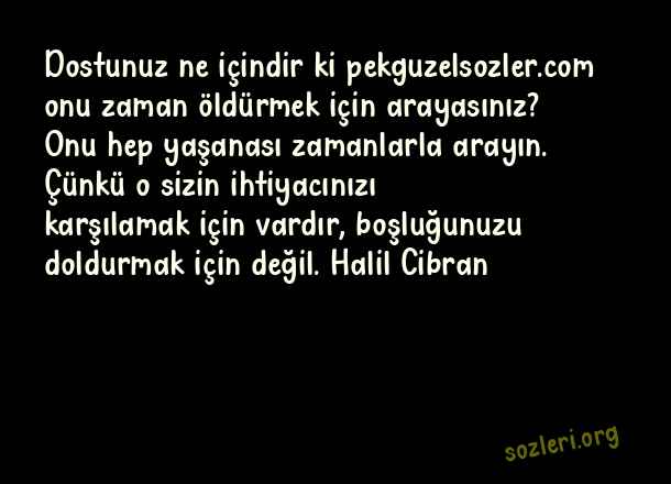 Dostunuz ne içindir ki onu zaman öldürmek için arayasınız? Onu hep yaşanası zamanlarla arayın. Çünkü o sizin ihtiyacınızı karşılamak için vardır, boşluğunuzu doldurmak için değil. Halil Cibran ( Boşluk )