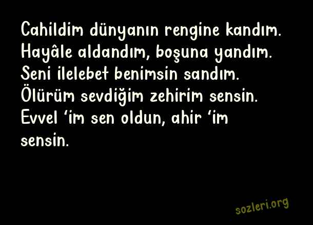 Cahildim dünyanın rengine kandım. Hayâle aldandım, boşuna yandım. Seni ilelebet benimsin sandım. Ölürüm sevdiğim zehirim sensin. Evvel ‘im sen oldun, ahir ‘im sensin. ( Dokunaklı Mesajlar )