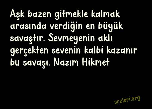 Aşk bazen gitmekle kalmak arasında verdiğin en büyük savaştır. Sevmeyenin aklı gerçekten sevenin kalbi kazanır bu savaşı. Nazım Hikmet ( Eşsiz Sözler )