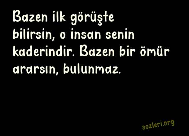 Bazen ilk görüşte bilirsin, o insan senin kaderindir. Bazen bir ömür ararsın, bulunmaz. ( Eşsiz Sözler )
