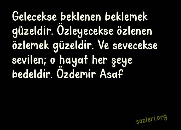 Gelecekse beklenen beklemek güzeldir. Özleyecekse özlenen özlemek güzeldir. Ve sevecekse sevilen; o hayat her şeye bedeldir. Özdemir Asaf ( Eşsiz Sözler )