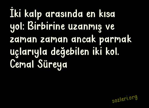 İki kalp arasında en kısa yol: Birbirine uzanmış ve zaman zaman ancak parmak uçlarıyla değebilen iki kol. Cemal Süreya ( Eşsiz Sözler )