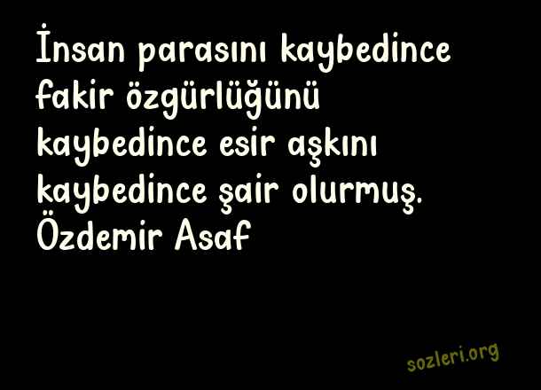 İnsan parasını kaybedince fakir özgürlüğünü kaybedince esir aşkını kaybedince şair olurmuş. Özdemir Asaf ( Eşsiz Sözler )