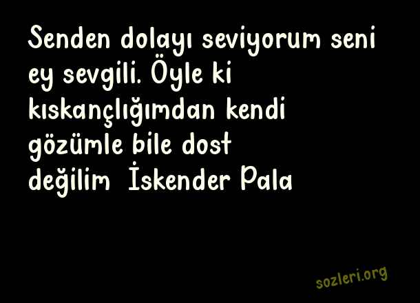 Senden dolayı seviyorum seni ey sevgili. Öyle ki kıskançlığımdan kendi gözümle bile dost değilim… İskender Pala ( Eşsiz Sözler )