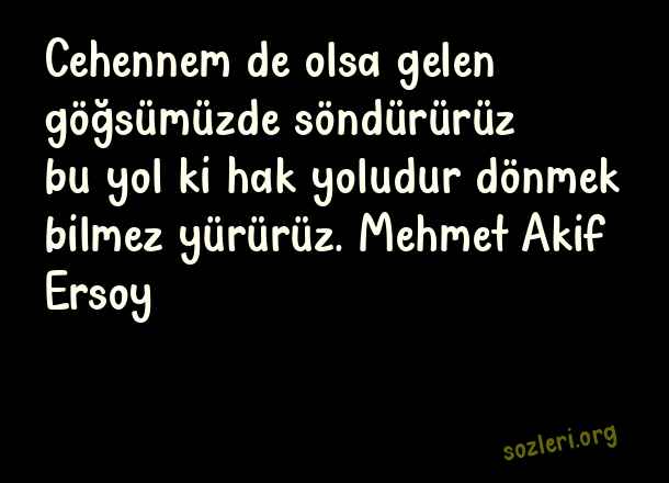 Cehennem de olsa gelen göğsümüzde söndürürüz bu yol ki hak yoludur dönmek bilmez yürürüz. Mehmet Akif Ersoy ( Günün En Güzel )