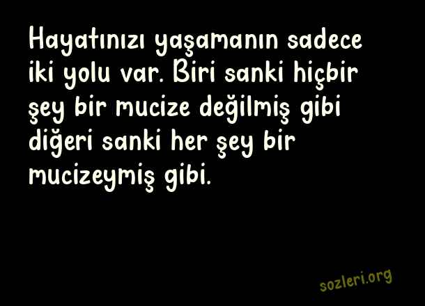 Hayatınızı yaşamanın sadece iki yolu var. Biri sanki hiçbir şey bir mucize değilmiş gibi diğeri sanki her şey bir mucizeymiş gibi. ( Güzel Sözler Sayfası )