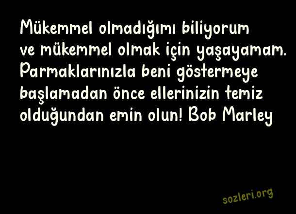 Mükemmel olmadığımı biliyorum ve mükemmel olmak için yaşayamam. Parmaklarınızla beni göstermeye başlamadan önce ellerinizin temiz olduğundan emin olun! Bob Marley ( Güzel Sözler Sayfası )