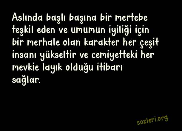 Aslında başlı başına bir mertebe teşkil eden ve umumun iyiliği için bir merhale olan karakter her çeşit insanı yükseltir ve cemiyetteki her mevkie layık olduğu itibarı sağlar. ( Kişilik )