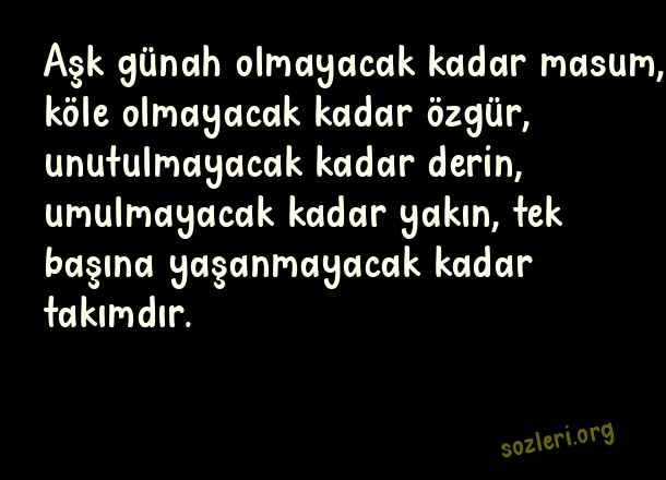 Aşk günah olmayacak kadar masum, köle olmayacak kadar özgür, unutulmayacak kadar derin, umulmayacak kadar yakın, tek başına yaşanmayacak kadar takımdır. ( Saf Sözler )
