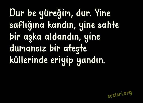 Dur be yüreğim, dur. Yine saflığına kandın, yine sahte bir aşka aldandın, yine dumansız bir ateşte küllerinde eriyip yandın. ( Saf Sözler )