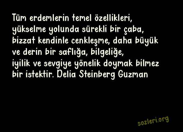 Tüm erdemlerin temel özellikleri, yükselme yolunda sürekli bir çaba, bizzat kendinle cenkleşme, daha büyük ve derin bir saflığa, bilgeliğe, iyilik ve sevgiye yönelik doymak bilmez bir istektir. Delia Steinberg Guzman ( Saf Sözler )