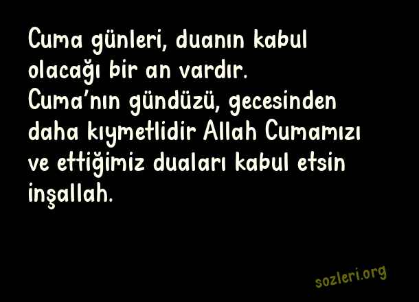 Cuma günleri, duanın kabul olacağı bir an vardır. Cuma’nın gündüzü, gecesinden daha kıymetlidir Allah Cumamızı ve ettiğimiz duaları kabul etsin inşallah. ( Whatsapp Cuma )