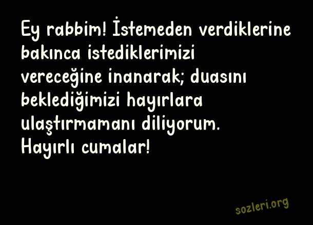 Ey rabbim! İstemeden verdiklerine bakınca istediklerimizi vereceğine inanarak; duasını beklediğimizi hayırlara ulaştırmamanı diliyorum. Hayırlı cumalar! ( Whatsapp Cuma )