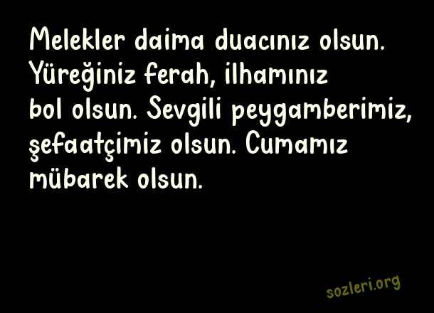 Melekler daima duacınız olsun. Yüreğiniz ferah, ilhamınız bol olsun. Sevgili peygamberimiz, şefaatçimiz olsun. Cumamız mübarek olsun. ( Whatsapp Cuma )