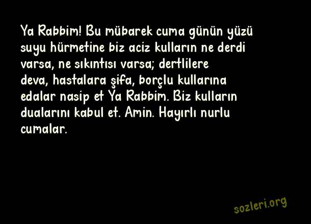 Ya Rabbim! Bu mübarek cuma günün yüzü suyu hürmetine biz aciz kulların ne derdi varsa, ne sıkıntısı varsa; dertlilere deva, hastalara şifa, borçlu kullarına edalar nasip et Ya Rabbim. Biz kulların dualarını kabul et. Amin. Hayırlı nurlu cumalar. ( Whatsapp Cuma )