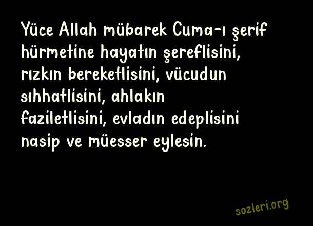 Yüce Allah mübarek Cuma-ı şerif hürmetine hayatın şereflisini, rızkın bereketlisini, vücudun sıhhatlisini, ahlakın faziletlisini, evladın edeplisini nasip ve müesser eylesin. ( Whatsapp Cuma )