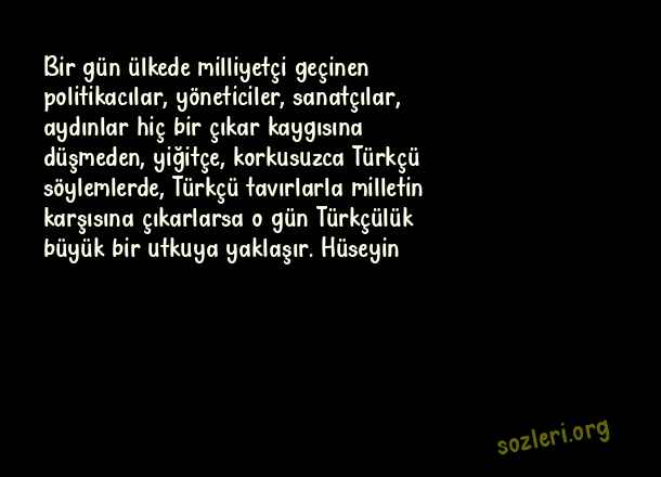 Bir gün ülkede milliyetçi geçinen politikacılar, yöneticiler, sanatçılar, aydınlar hiç bir çıkar kaygısına düşmeden, yiğitçe, korkusuzca Türkçü söylemlerde, Türkçü tavırlarla milletin karşısına çıkarlarsa o gün Türkçülük büyük bir utkuya yaklaşır. Hüseyin ( Yiğitlik )