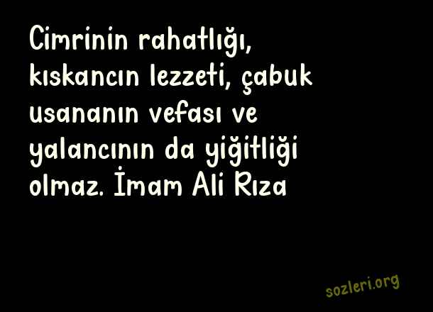 Cimrinin rahatlığı, kıskancın lezzeti, çabuk usananın vefası ve yalancının da yiğitliği olmaz. İmam Ali Rıza ( Yiğitlik )