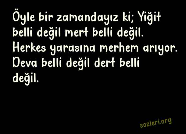 Öyle bir zamandayız ki; Yiğit belli değil mert belli değil. Herkes yarasına merhem arıyor. Deva belli değil dert belli değil. ( Yiğitlik )