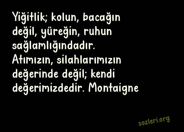 Yiğitlik; kolun, bacağın değil, yüreğin, ruhun sağlamlığındadır. Atımızın, silahlarımızın değerinde değil; kendi değerimizdedir. Montaigne ( Yiğitlik )