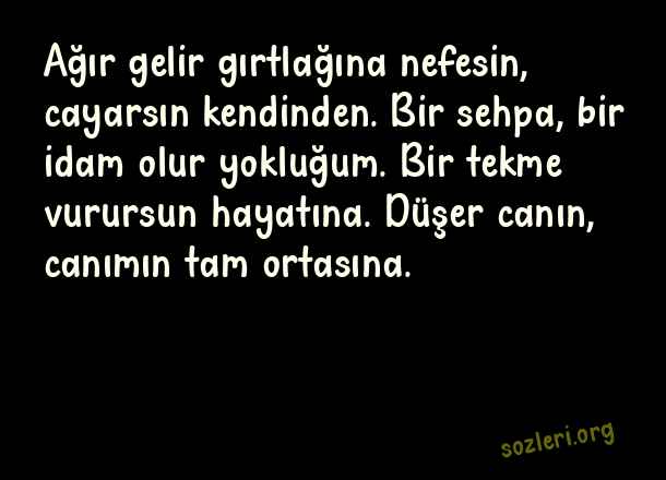 Ağır gelir gırtlağına nefesin, cayarsın kendinden. Bir sehpa, bir idam olur yokluğum. Bir tekme vurursun hayatına. Düşer canın, canımın tam ortasına. ( Yokluk )