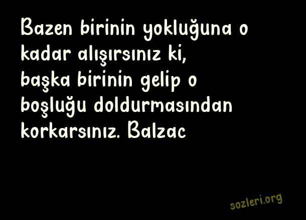 Bazen birinin yokluğuna o kadar alışırsınız ki, başka birinin gelip o boşluğu doldurmasından korkarsınız. Balzac ( Yokluk )