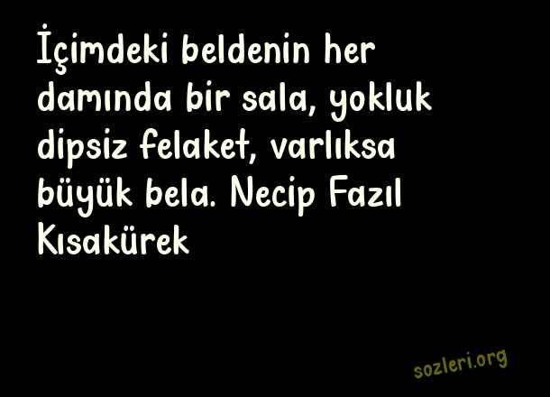 İçimdeki beldenin her damında bir sala, yokluk dipsiz felaket, varlıksa büyük bela. Necip Fazıl Kısakürek ( Yokluk )