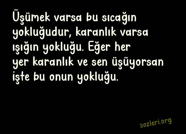 Üşümek varsa bu sıcağın yokluğudur, karanlık varsa ışığın yokluğu. Eğer her yer karanlık ve sen üşüyorsan işte bu onun yokluğu. ( Yokluk )