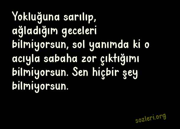 Yokluğuna sarılıp, ağladığım geceleri bilmiyorsun, sol yanımda ki o acıyla sabaha zor çıktığımı bilmiyorsun. Sen hiçbir şey bilmiyorsun. ( Yokluk )