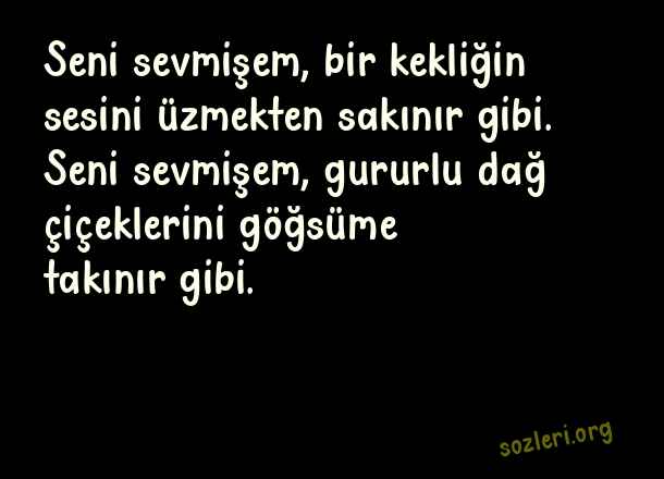 Seni sevmişem, bir kekliğin sesini üzmekten sakınır gibi. Seni sevmişem, gururlu dağ çiçeklerini göğsüme takınır gibi. ( Yusuf Hayaloğlu )