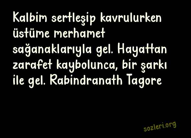 Kalbim sertleşip kavrulurken üstüme merhamet sağanaklarıyla gel. Hayattan zarafet kaybolunca, bir şarkı ile gel. Rabindranath Tagore ( Zarafet )