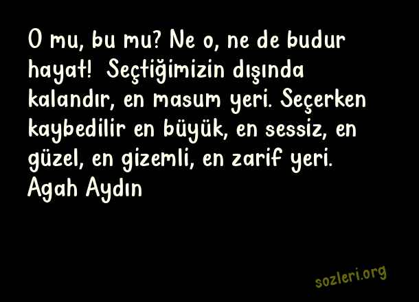 O mu, bu mu? Ne o, ne de budur hayat! Seçtiğimizin dışında kalandır, en masum yeri. Seçerken kaybedilir en büyük, en sessiz, en güzel, en gizemli, en zarif yeri. Agah Aydın ( Zarafet )