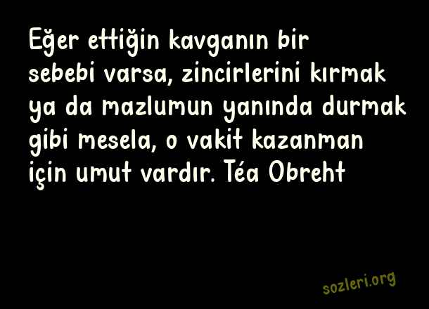 Eğer ettiğin kavganın bir sebebi varsa, zincirlerini kırmak ya da mazlumun yanında durmak gibi mesela, o vakit kazanman için umut vardır. Téa Obreht ( Zincirleri Kırmak )